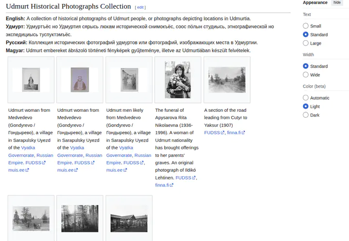 Wikimedia Commons access pointThe Udmurt Historical Photographs Collection is a growing, open, and linked collection of dispersed historical photographs of Udmurt people and places in Udmurtia. We bring together relevant photographs (or their digital surrogates) and aim to place them under the care of the Udmurt community and researchers of Udmurt cultural history.