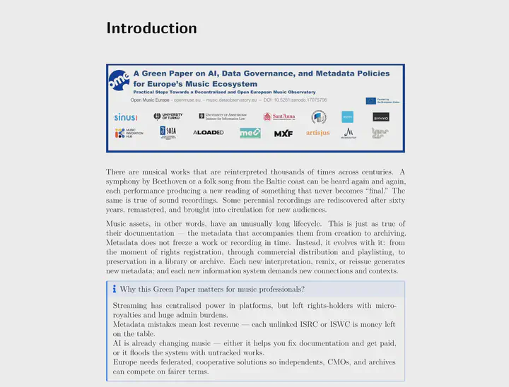 This Green Paper is an open consultation draft produced by the Open Music Europe consortium as part of Horizon Europe Deliverable D5.7.