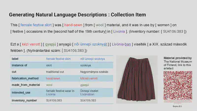 Many small communities lack trained librarians, information professionals, or technical ontologists. Therefore, we must offer tools and workflows that can convert structured data into natural-language descriptions in Liv, Mari, Seto, or other relevant languages. Using computational linguistics and native speaker input, we aim to generate readable, accurate sentences—enabling the production of culturally grounded encyclopedic content, and empowering community members to reclaim access to knowledge historically fragmented and dispersed across external archives.
